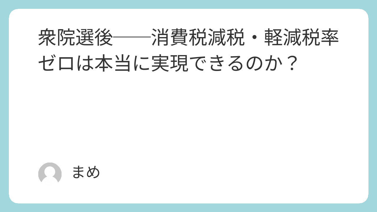 - しかし、消費税率や軽減税率の変更は法律上、国会の審議・可決が必須であり、即時実現が約束されたものではない。